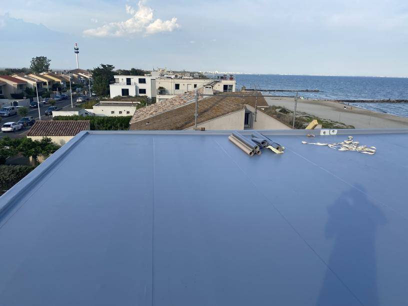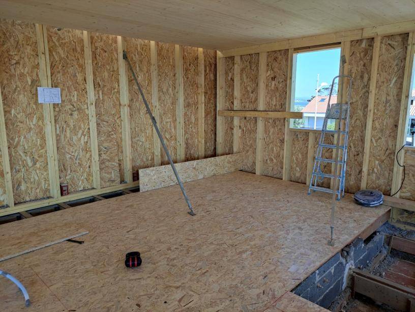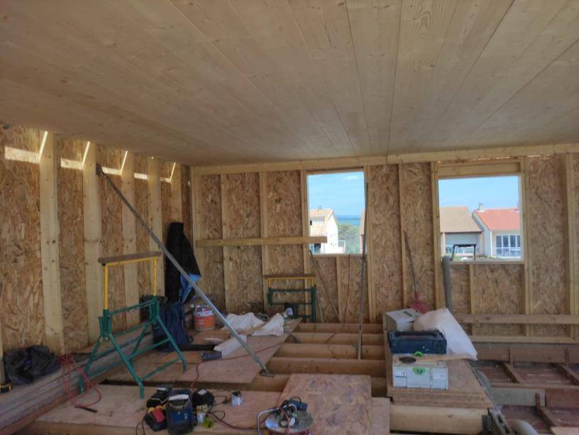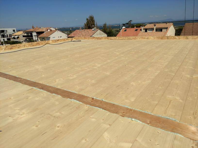 surélévation en ossature bois de 82 mètre carré rajoutant un second étage à cette villa de bord de mer, est maintenant hors d'eau suite a la réalisation du toit plat par notre équipe de